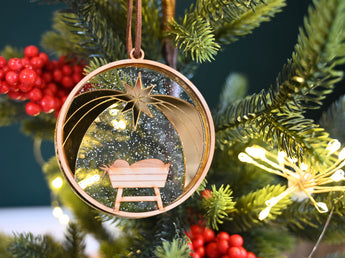 Add this delicate layered ornament to your tree to remember the reason for the season. With a Lamb in the front and the golden star and glitter backing this is a unique and stunning ornament to hang on your tree! Sized to 5cm