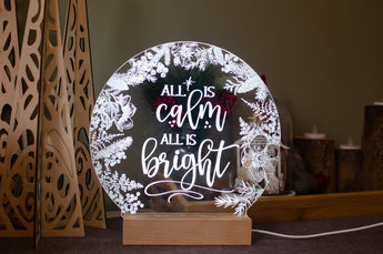 Made using a wooden led base and a slot in 5mm perspex engraved panel to create a beautiful and unique design, with a USB wire. Can be plugged into a wall adaptor or a laptop/ computer.