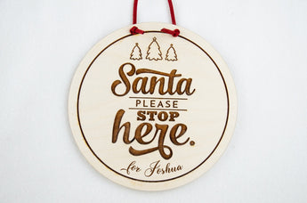 Santa please stop here for personalised name sign, perfect for hanging in your home to celebrate your little ones christmas. Can be engraved with any name or names. Perfect keepsake to use year after year.They measure 10x10cmMade from Laser Birch Plywood, to give a lovely Scandinavian finish to the sign perfect for any Christmas decor style, with laser engraved details, this design is truly unique and makes a stunning decoration for your homer!