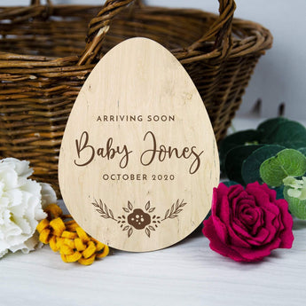 Announce your special arriving soon news over easter with this wooden egg baby announcement. Personalised to your name and date. This decoration can be given as a gift or used in a photo to create the perfect keepsake.