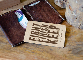 Add scripture straight into your wallet with our wooden engraved wallet cards. Engraved on 1mm thick birch plywood, our card can be added to your pocket without being bulky.