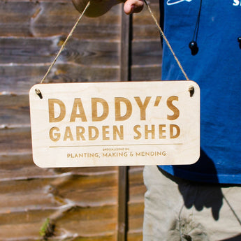 Give a unique and personalised gift for fathers day, with our wooden shed sign, daddy's garden shed engraved sign. Perfect for hanging in a shed, office or garage. Can be engraved with custom wording to make this a unique gift for you to give to your dad or grandad.