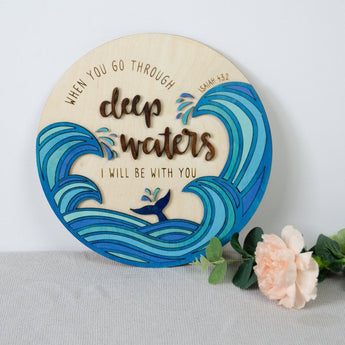 Decorate your home with a nautical wooden sign, perfectly engraved with a encouraging christian verse 'when you go through deep waters, i will be with you' - Isaiah 43:2 Ocean waves wooden wall art perfect to decorate any room. This beautiful sign has been hand painted in ocean colours perfect to decorate your house and become the focal point of any room.