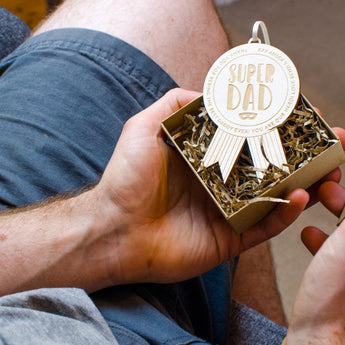 Let your dad know how special they are this father's day with our engraved wooden Super dad medal, complete with personalised text that you can write a little message to your dad (husband) perfect for gifting as a gift from the kids.