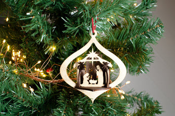 Hang a unique and special ornament on your tree with our scene stable, mary joseph and jesus 3d ornament, stunning details cut into this ornament with  surrounded by Bethlehem and two palm trees.