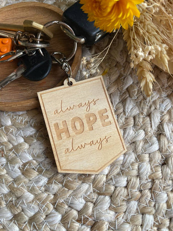 Always Hope alwyas engraved wooden keyring. Perfect for gift giving, whether it’s starting a new school, moving house or simply a occasion to celebrate. Approximately 5cm long Made using laser technology on 3mm birch plywood.