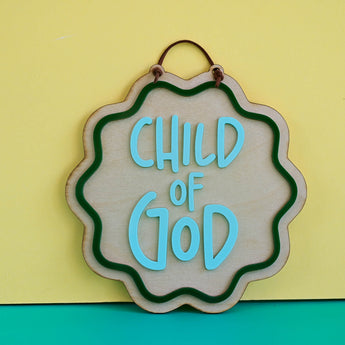 Add this fun colour pop to any room, made using birch plywood and bold acrylic to create a instant colour and truth pop into any space! Colour way: Dark Green + Baby Blue With the Child of God sized to 145mm
