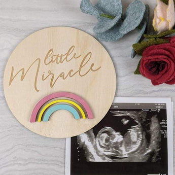 Wooden rainbow baby little miracle newborn disc. Create stunning memories and photos with this wooden rainbow newborn or pregnancy announcement, photo prop sign. Perfect to add to a photo to create a beautiful new baby memory.
