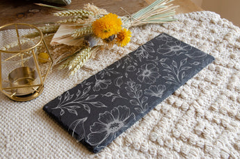 Serve food in style with our full floral engraved serving platter, the perfect size for a cozy evening. Sized to 30x12cm Each slate is unique.