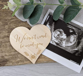 Designed to be used with a photo or image on your fridge! This is a engraved wooden heart magnet, engraved with the wording I can’t wait to meet you. Perfect to use in addition to a ultrasound or photo on the fridge.