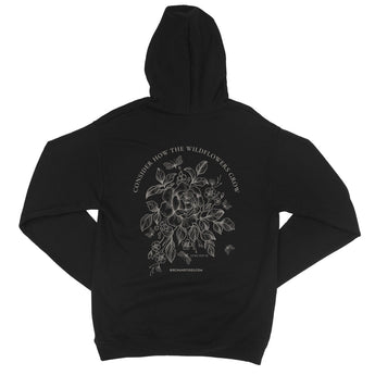 Loose fit hoodie with front pocket and colour-matched cords. Medium weight. With Consider how the Wildflowers grow design.