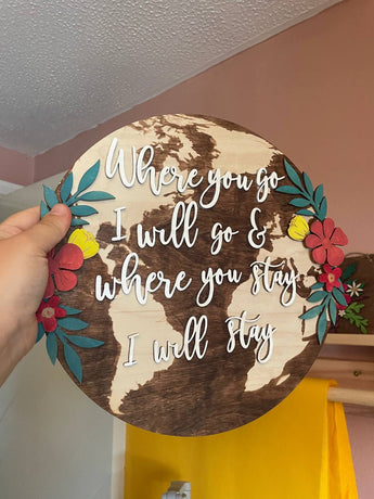 'Where you go I will go and where you stay I will stay' (Ruth 1:16) -  Bible verse wall art perfect to decorate a nursery or as a gift for her. This beautiful sign has been hand painted in bright bold colours perfect to decorate your house and become the focal point of any room.