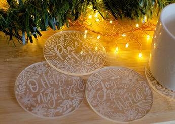 Bring the festivities into your home with our drink coaster set. A set of 4 Clear engraved coasters are the perfect addition to your home this festive season.