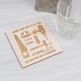 Give a special and meaningful gift, with this work tools, 'commit your work to the lord and your plans will be established' bible verse engraved wooden coaster. Makes a perfect Fathers Day gift! Sized to 4x4inchs to make the perfect drinks coaster!