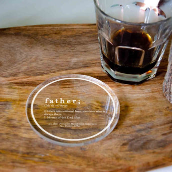 Give a unique and personalised gift for fathers day, with our engraved definition of father 5mm acrylic drink coaster, the perfect gift for a unique fathers day present.