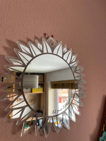 Decorate your home with Engraved - Let your light shine sunflower wall mirror. Perfect reminder to add to your home Made from mirrored acrylic, engraved with wording and floral details. Sized to 25cm