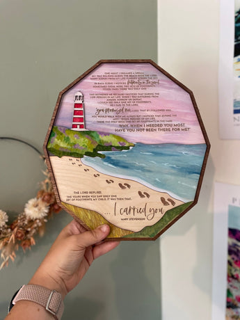 Hand painted layered footprints in the sand wooden wall sign, perfect addition to your home. made using FSC sourced birch plywood, hand painted in watercolour style to create a beautiful sunset beach scene. sized to 30x25cm