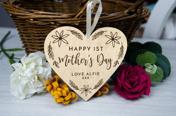 Celebrate her first mother's day, with a keepsake wooden heart. Engraved with Happy 1st Mother's Day and can be personalised with your little ones name.
