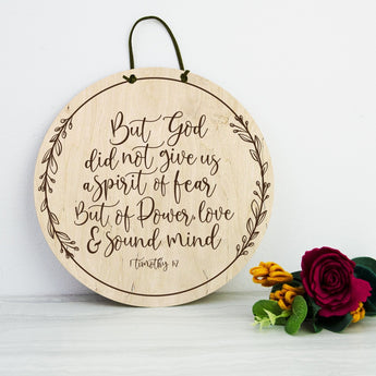 In this uncertain times we often fall back on uplifting and encouraging scripture like 1 Timothy 1:7 God did not give us a spirit of fear, but of power, love and a sound mind. Hang this beautiful script sign around your home to remember and celebrate this verse.