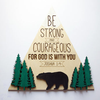 Be Strong & Courageous - Joshua 1:9 wooden bible verse wall art perfect for an adventure or outdoor themed room especially a nursery or child's room. This scripture wall art sign is engraved with the bible verse Joshua 1:9 and hand painted to create a stunning finished sign!