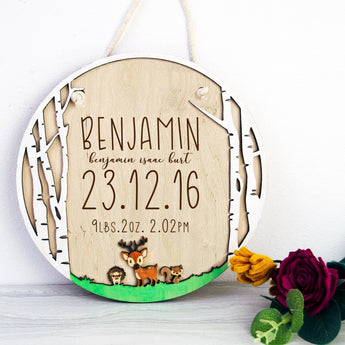 Celebrate your newborns birth and arrival with this personalised woodland sign that compliments your nursery decor and will be cherished forever!