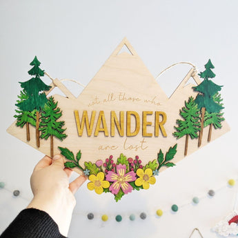 Decorate your home with our stunning hand-painted wooden wall hanging, engraved with the JR Tolkien quote: 'Not all who wander are lost', with a delicate floral arrangement sandwiched between a forest of trees, this sign will transform any space, whether its a bedroom or living space, you do not want to miss hanging this piece in your home.