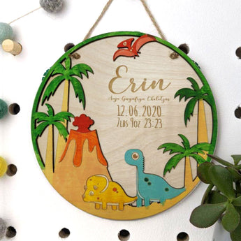 Celebrate your newborn's arrival with this personalised dinosaur woodland sign that compliments any nursery decor and will be cherished forever! Engraved with your newborn's birth details, to make it the perfect keepsake that will last for years and years.