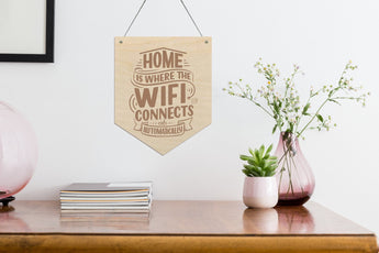 Add some fun designs to your home with our wifi home wooden banners, perfect to decorate your home! This sign is made using sustainably sourced birch plywood.