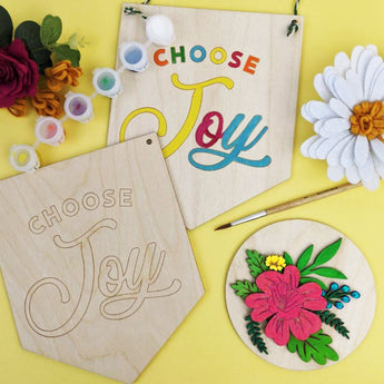 A fun and easy creative project to paint at home perfect for children or adults. Spend some time being creative with our Choose Joy DIY wooden banner and flower magnet in this painting kit which contains everything you need to decorate and paint your encouraging positive banner and flower magnet.