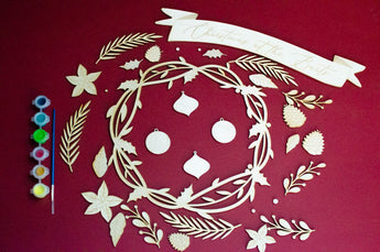Do it yourself, with friends over zoom or simply as a sweet festive activity. Decorate, paint, arrange and glue your very own wooden Christmas wreath. Complete with a personalised family name banner design to make this a fun and unique gift idea for yourself or a loved one.