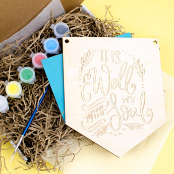 A fun and easy creative project to paint at home perfect for children or adults. Spend some time being creative with our it is well with my soul DIY wooden banner painting kit which contains everything you need to decorate and paint your encouraging positive banner.