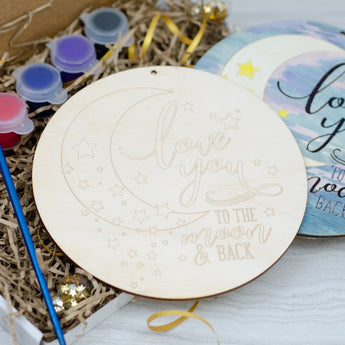 A fun and easy creative project to paint at home perfect for children or adults. Spend some time being creative with our love you to the moon and back DIY wooden plaque in this painting kit which contains everything you need to decorate and paint your encouraging positive banner and rainbow magnet.