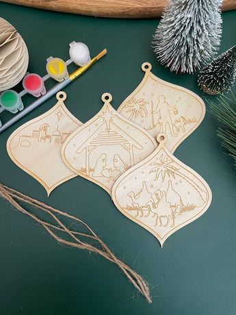 Set of 4 paint your own ornament set, includes 6 paint colours, and a paint brush, 4 outlined ornaments and 4 hangers.