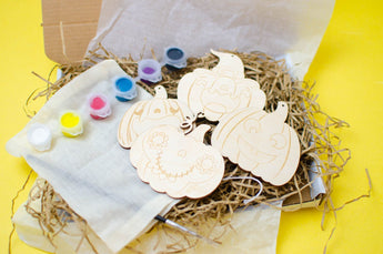 Kit includes 4 unique wooden pumpkins, set of 6 paint colours, paintbrush and a cotton bag to hold them all in.