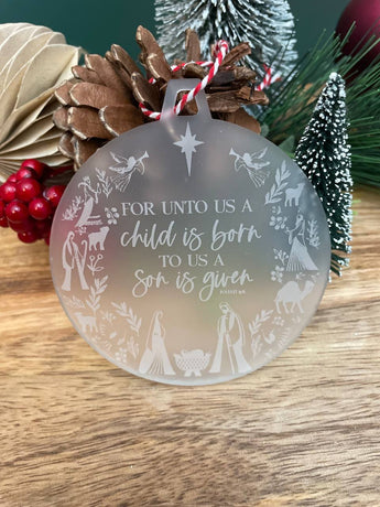 Engraved frosted ornament engraved with A child is born Isaiah 9:6 with focus on the nativity scene, Mary, Joseph and Baby Jesus