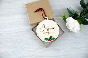 Personalised First Christmas Ivy wooden tree ornament, with delicate hand painted ivy details, to create a stunning bauble perfect for celebrating your family this year!We have made this delicate ornament using modern laser engraving technology which guarantees absolutely precision and smooth edges.Each bauble measures approx. 3inch x 3inch
