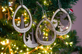 Decorate your tree with our christmas story ornaments perfect for adding bits of the christmas story to your tree. Made using FSC sourced plywood, each ornament is engraved with a unique pattern. Sized to 85x70mm