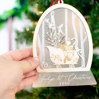 Celebrate their first Christmas with our stunning snowglobe Santas sleigh ornaments, perfect keepsake to celebrate their first Christmas. You can hang year after year. These ornaments can be personalised with your little one's name/ names on the bottom, to create a piece unique to you and your family.