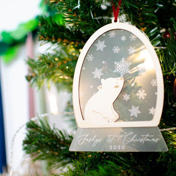 Celebrate your little one's first Christmas with our sweet polar bear snowglobe ornament. You can hang year after year. These ornaments can be personalised with your little one's name or different wording to make these unique to you and your loved ones!