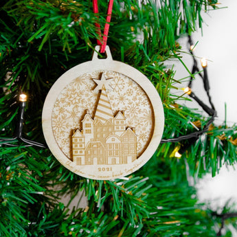 Remember 2021 as the year we came back together with our unique 2021, featuring a Christmas town and engraved wording, the perfect addition to your tree this year!