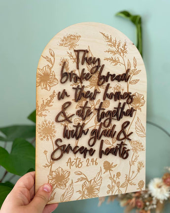 Decorate your home with our They Broke bread in their homes & ate together with glad & sincere hearts - Acts 2:46 wooden signs, perfect for adding to your wall or mantle piece.