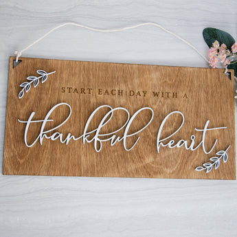 Decorate your home with this beautiful thankful heart sign quote wall art. Perfect to give as a new home or encouragement gift or buy to decorate your home. This stunning wall decor is the perfect detail to add to any room in your house. With delicate typography laser cut and engraved to make this a truly unique gift.