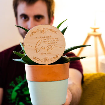 Celebrate all the hard work teachers have put in this year, with a lovely engraved; 'a teacher takes a hand, opens a mind and touches a heart' wooden plant topper. This is the perfect addition to a plant to make your gift personalised and special for your favourite teacher.