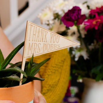 Thank your teacher this year with this personalised thank you plant pot topper. A perfect unique way to say thank you to the teachers in your life. Designed to be placed within a plant pot or a bunch of flowers, this lovely wooden personalised topper doubles up as an alternative card.Made from Laser Birch Plywood, to give a lovely finish to the plant pot topper, perfect for any decor style, with laser engraved details, this design is truly unique and makes a stunning decoration for your home.We have made this delicate decoration using modern laser engraving technology which guarantees absolutely precision and smooth edges.Each plant pot topper measures approx. 8cmx5cm