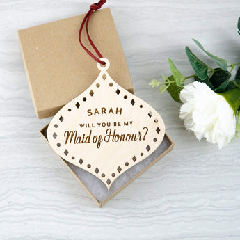 Propose to your closest friend and ask them to play one of the most important roles in your wedding by using this will you be my maid of honour ornament or tag.
