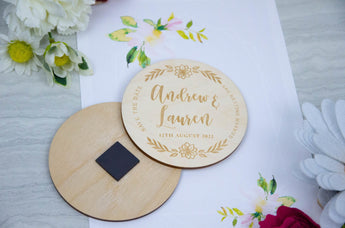 Save your wedding date with our uniqe and personalised wedding save the date wooden magnets with beautiful printed backing card.