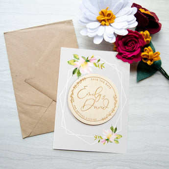 Save your wedding date with our uniqe and personalised wedding save the date wooden magnets with beautiful printed backing card. Sized to 3mm diameter, made from sustainable birch plywood.