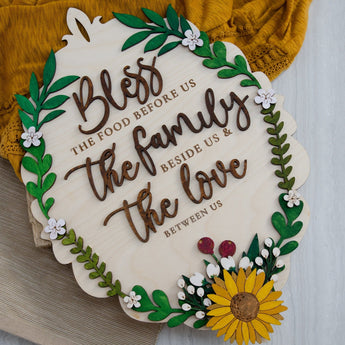 Beautiful wooden floral sign perfect to decorate any room in your house! Bless the food before us, the family beside us, and the love between us wall hanging sign. This wall sign is laser cut with delicate floral details that have been hand-painted to create a stunning piece of art to treasure!