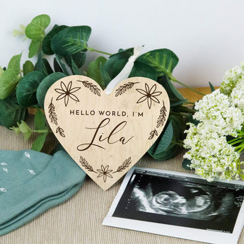 Create precious memories with this wooden Hello, world I'm ... newborn baby announcement tag, a great addition to add to your photos or memory box.