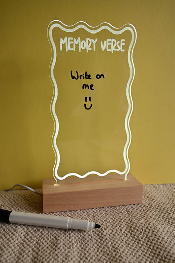 A new way to help you learn a verse, simply write the verse you would like to learn on the perspex, slot into your base and enjoy being reminded everyday of the verse! Comes with a white board marker pen, simply write on and then wipe off.
